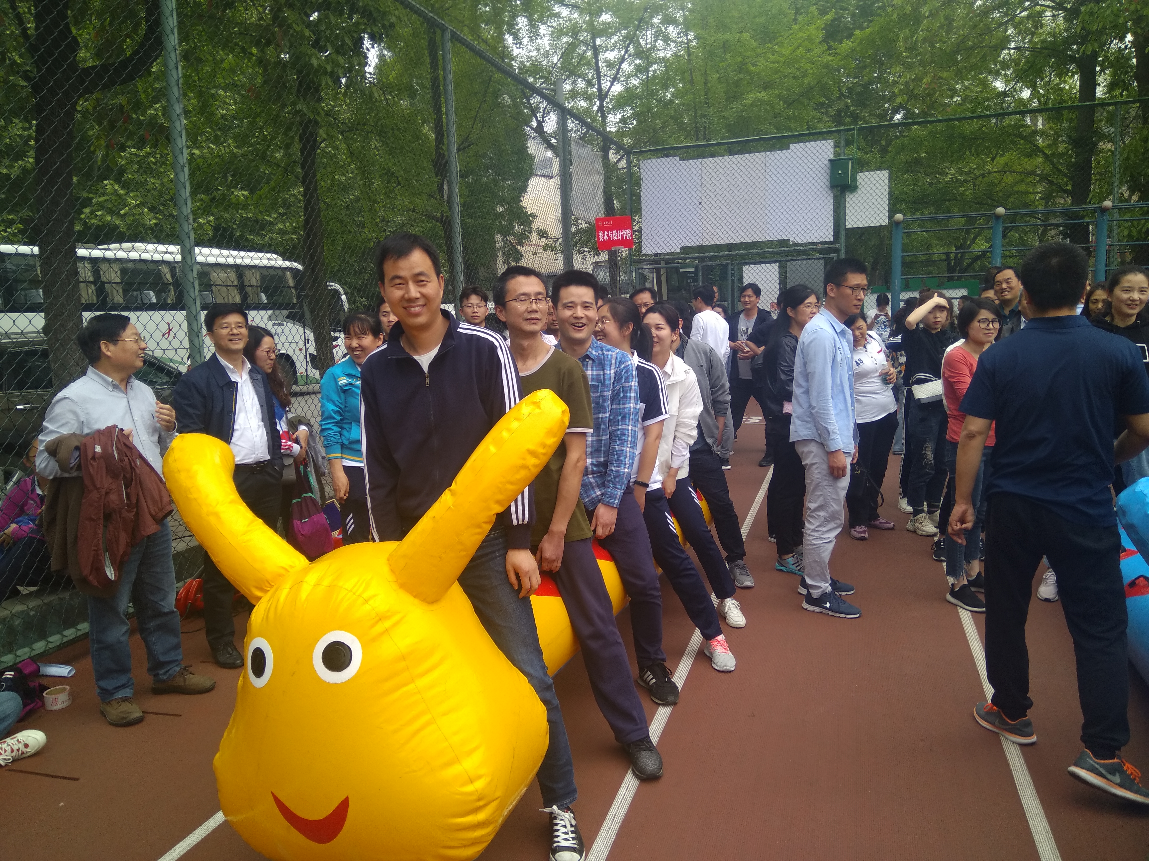 下午,教职工们的热情随着攀升的气温被点燃,运动场处处都是认真训练的队伍,到处都在“鼓动人心”。下午第一个项目毛毛虫比赛,我院6位大长腿美女帅哥摩拳擦掌,跃跃欲试,随着裁判的一声哨响,骑着道具“毛毛虫”的队员们如脱缰的野马,一路狂奔,由于太过兴奋,6名队员节奏被打乱,虽然获得小组第一名,但整体排名成绩不佳,获得三等奖。下午第二个项目趣味投篮,该项目难度系数高,趣味性强,我院参赛队员踊跃,人数过多,工会临时决定按照试投成绩选拔最优战队,经过选拔的12名参赛队员各个身怀绝技,第一个上场的唐祁峰不负众望,5投5中的到5分,其他队员在他的带领小稳扎稳打,最后取得第6名的成绩,获得二等奖。最后一个项目是鼓动人心,由院长栾道成,副院长丁士华领衔主演的大戏终于登场,随着放球手把圆圆的网球放入鼓面,小小的网球上下跳跃,16人小心翼翼、全神贯注、密切配合、跳动的频率越来越快,三分钟完成了283次有效跳动,获得小组第一名。但其他小组的队伍技术更好,配合更佳,成绩更优,最后学院在最后一项比赛中取得第六名的好成绩,获得二等奖。