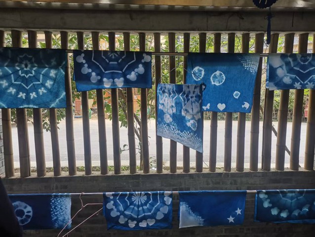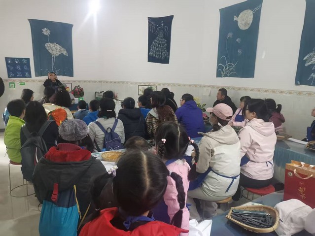 到达明月村后,教职工们乘坐观光车到达了今天的活动首站——刘氏染坊,开启了植物扎染体验。教职工们在老师的带领下认真学习植物扎染的相关知识和技法,亲身参与图案设计与捆扎、染制布料、解捆清洗、自然晾干等制作环节,在传统与现代交融中体悟匠人精神。