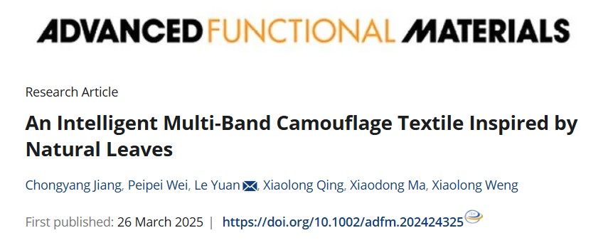 近日,必赢国际437袁乐教授团队在国际TOP期刊《Advanced Functional Materials》上发表题为“An Intelligent Multi-Band Camouflage Textile Inspired by Natural Leaves”的研究论文。《Advanced Functional Materials》2025最新影响因子为18.5,是材料领域公认的顶级期刊(中科院大类/小类一区Top期刊),同时被国际权威的自然指数评选为顶级期刊之一。袁乐教授为本论文唯一通讯作者,437bwin必赢国际材料学院2022级硕士研究生江重阳、437bwin必赢国际青年教师韦培培博士为该论文的共同一作,437bwin必赢国际为第一完成单位。