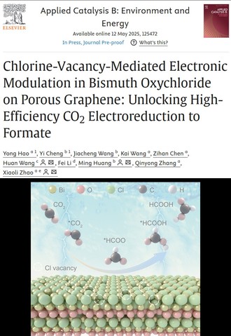 近日,必赢国际437赵小丽博士在SCI一区TOP期刊《Applied Catalysis B: Environment and Energy》(IF=20.3)上发表题为“Chlorine-Vacancy-Mediated Electronic Modulation in Bismuth Oxychloride on Porous Graphene: Unlocking High-Efficiency CO2 Electroreduction to Formate”的研究论文。《Applied Catalysis B: Environment and Energy》是催化、能源环境和材料化工领域公认的顶级期刊,即时影响因子为27。437bwin必赢国际为第一完成单位,437bwin必赢国际赵小丽博士为第一通讯作者,广州大学王欢教授和电子科技大学黄明教授为共同通讯作者,437bwin必赢国际材料学院2023级硕士研究生郝勇为论文第一作者。
